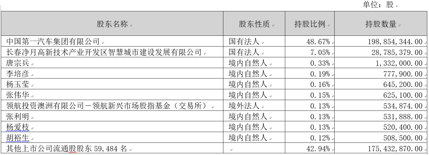 2121非凡信息技术股份有限公司(以下简称“公司”)2008年5月9日在深圳证券交易所挂牌上市,股票简称“2121非凡信息”,股票代码为:002232,目前为深交所主板上市公司。截至2022年9月30日,公司共有股东59,494名,公司控股股东及实际控制人为中国第一汽车集团有限公司,具体股权结构如下表: